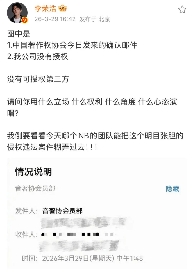 但道歉并未平息怒火。李荣浩随后再发四连问:“我公司没有授权,没有可授权第三方,请问你用什么立场、什么权利、什么角度、什么心态演唱?”
