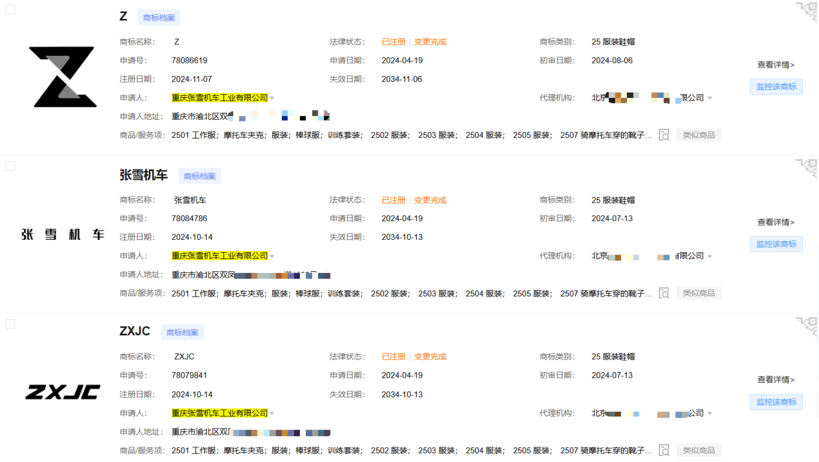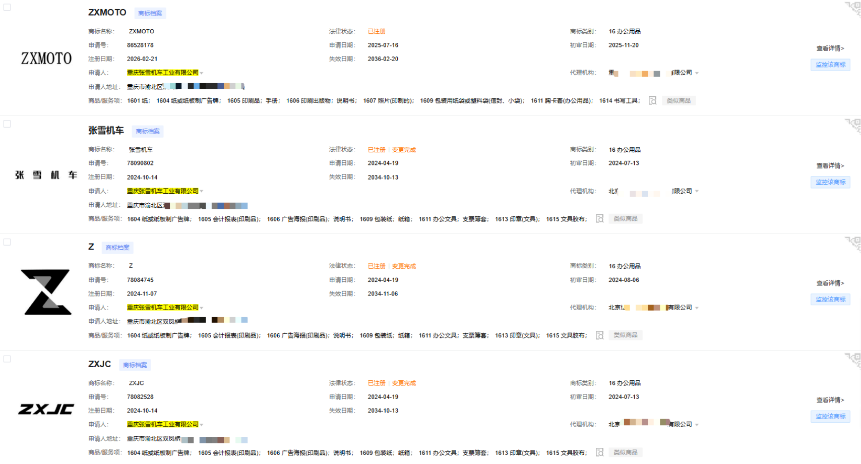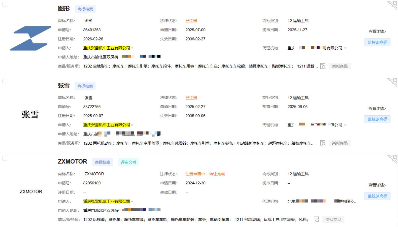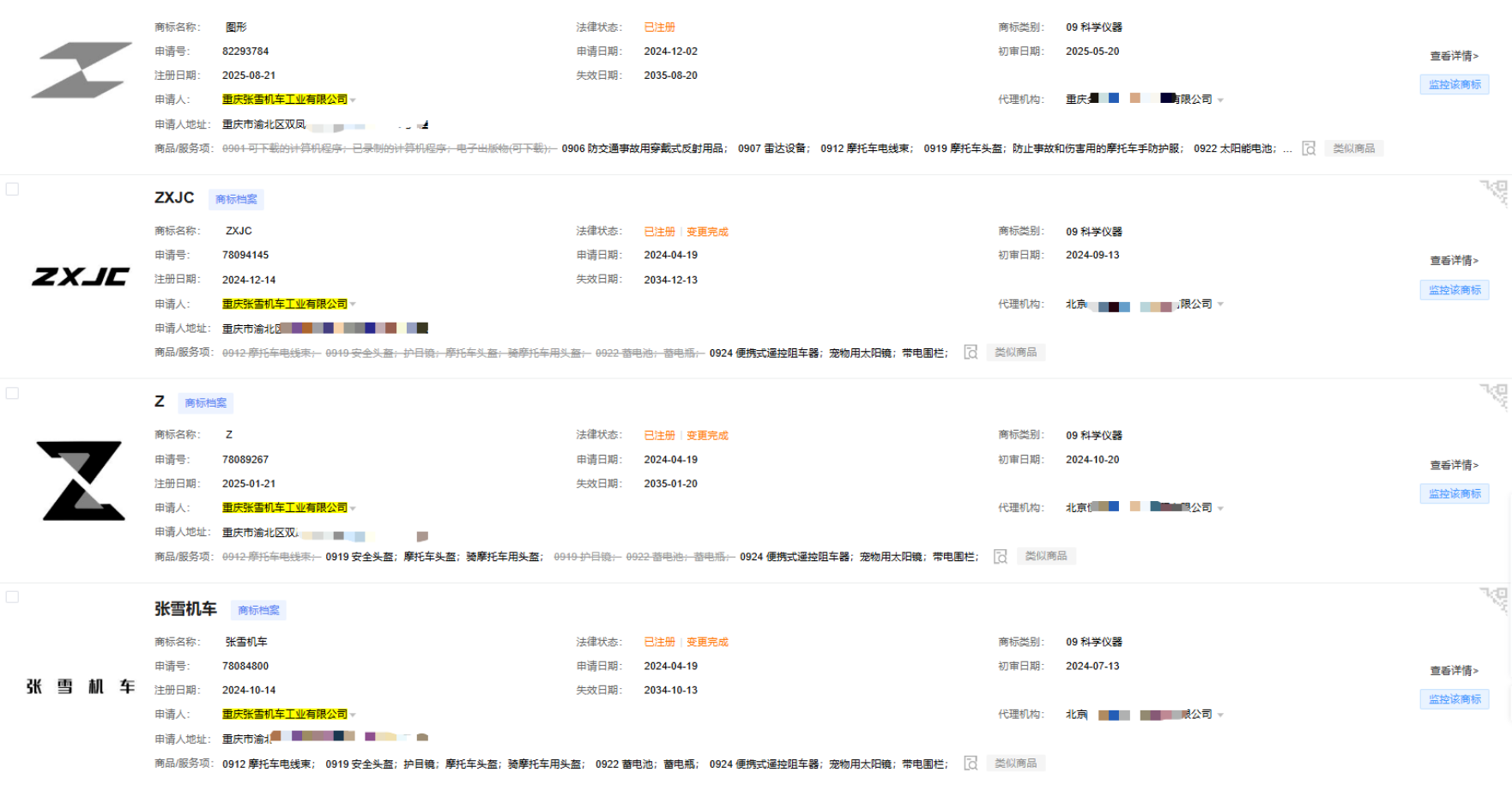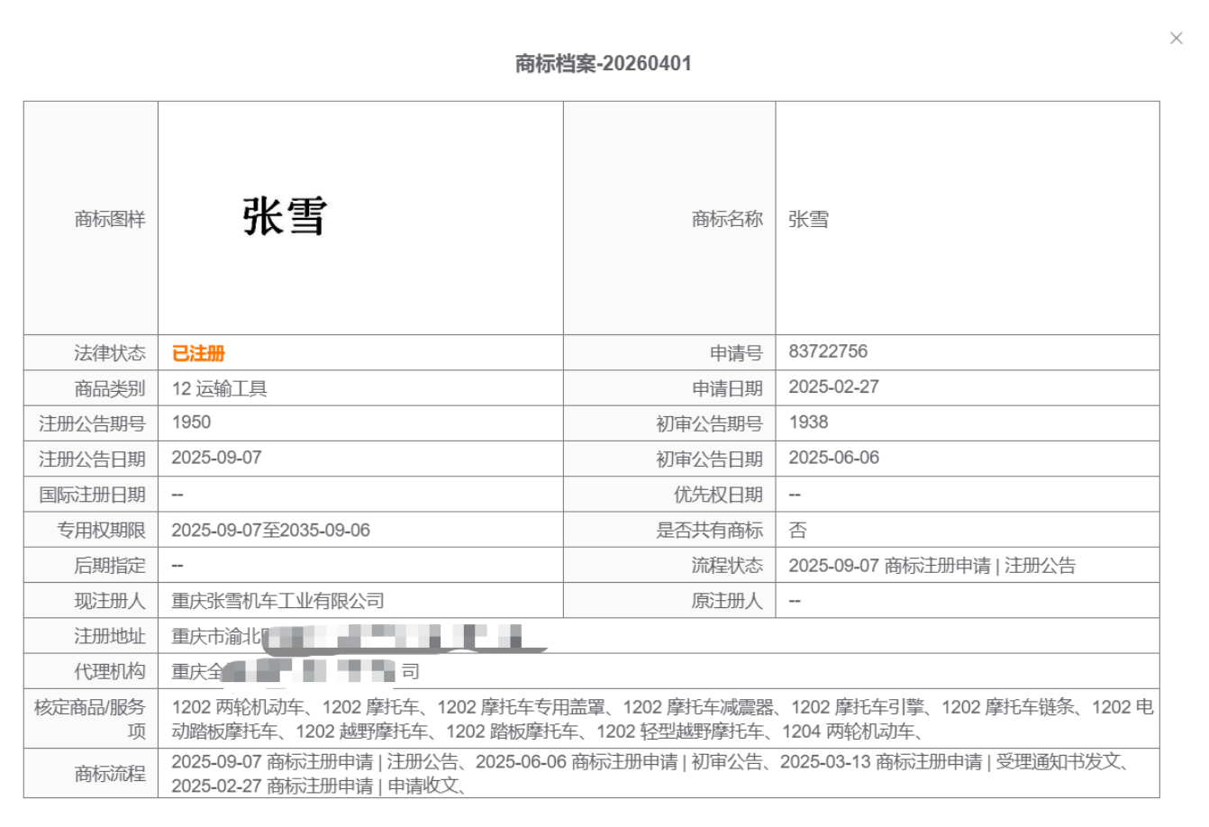 2.防御性布局还可加强。对于“张雪”这个创始人名字本身,仍可考虑补充近似字形、拼音等更全面的防御注册。毕竟,用创始人名字做品牌,本身就容易被人模仿——比如“张雷机车”“张雪摩托”之类的。