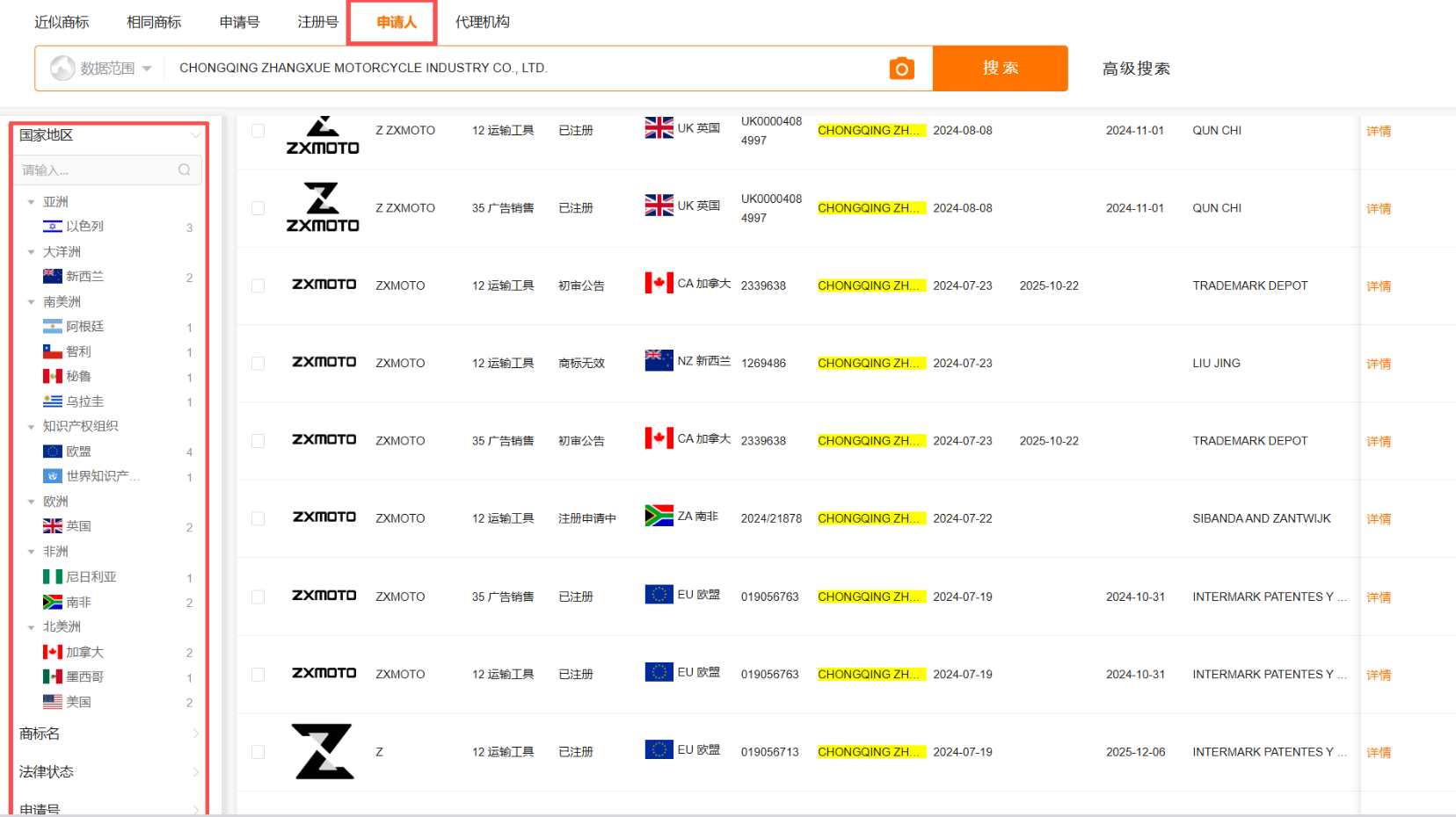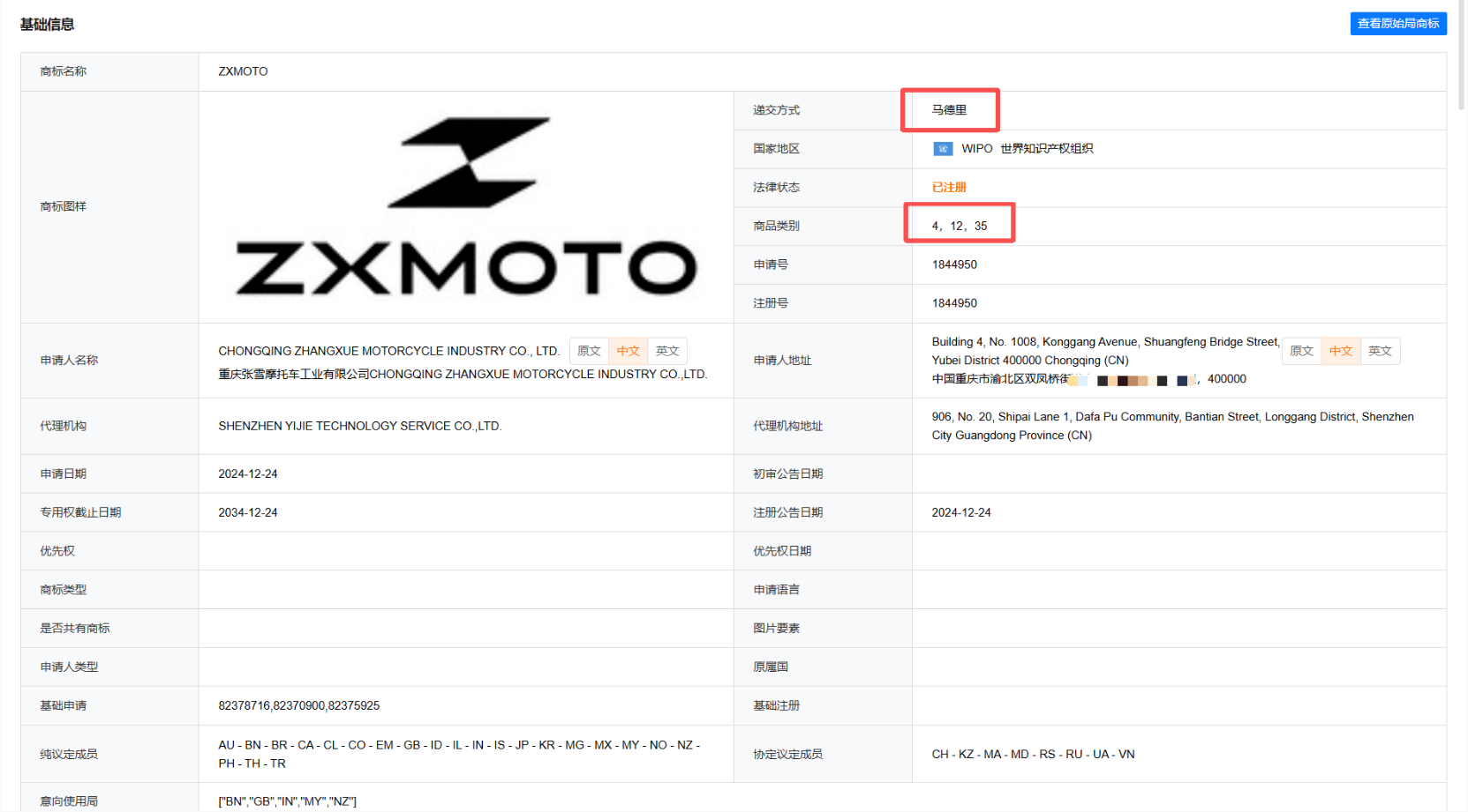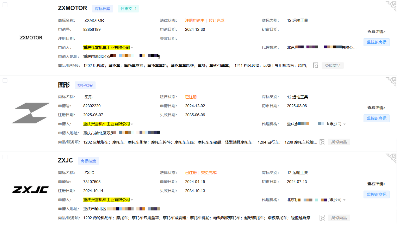 但其商标意识一点都不“新”,其名下一共申请了112枚商标,早在成立之初,公司就申请了“张雪”“张雪机车”“ZXJC”等多枚商标。核心的第12类(摩托车、越野摩托车、摩托车引擎)已覆盖,踩准了品牌创立的时间窗口,避免了“火了才发现商标不在自己手里”的常见问题。这一步,很多初创企业都没做到——等品牌火了才发现,核心类别被抢注了,要么买回来,要么被迫改名。