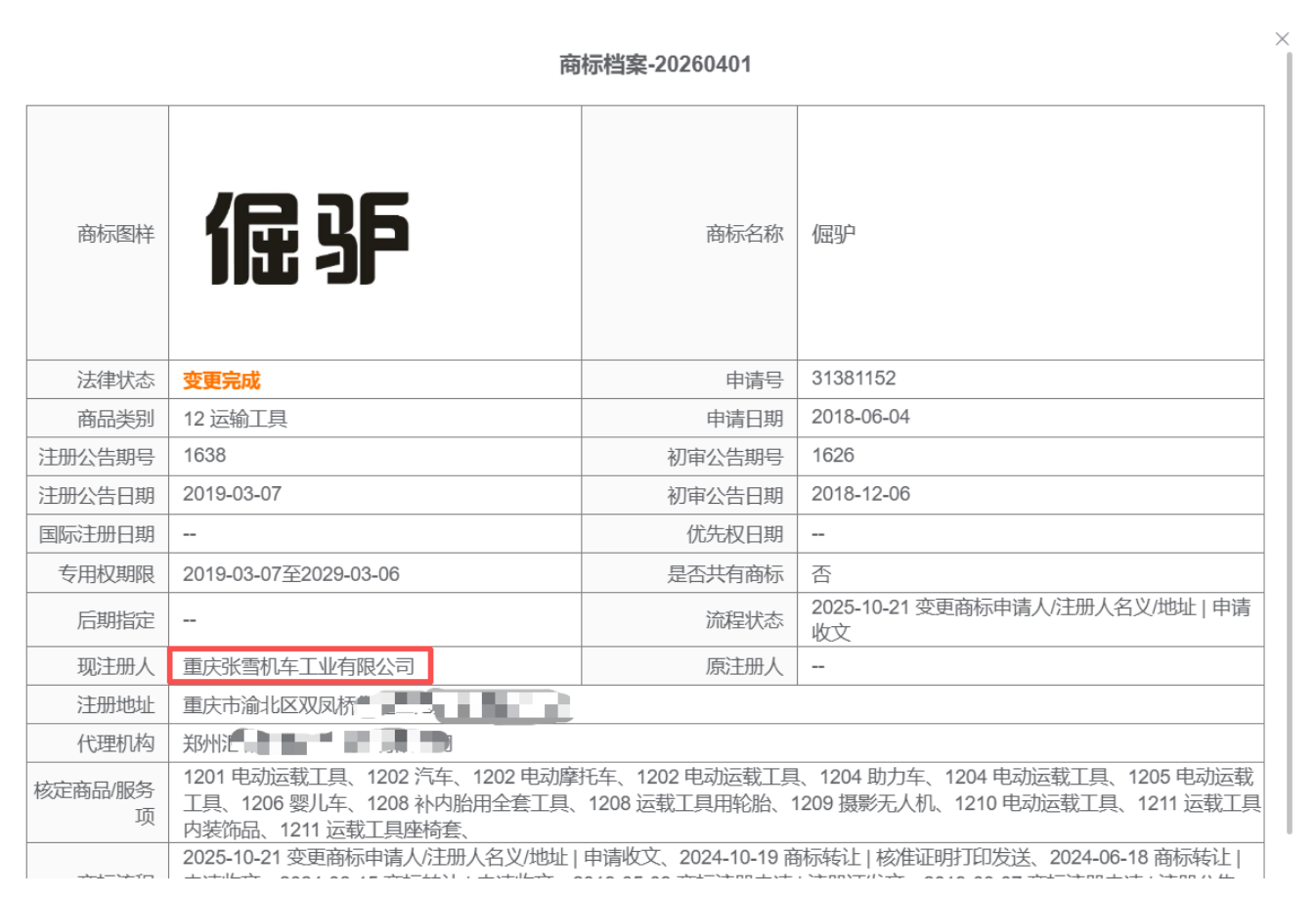 张雪机车的商标布局,在“核心锁定”和“关联覆盖”两个维度上做得相当扎实——核心类别卡位精准,衍生品类考虑周全,甚至还有“倔驴”这样有故事性的商标储备。